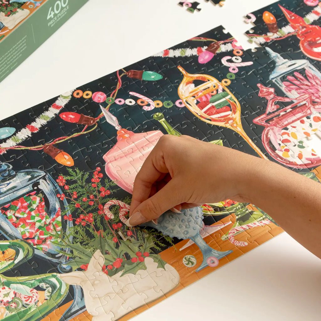 Indulge in the sweet nostalgia of the season with this panoramic holiday puzzle, featuring a hand-painted candy jar display brimming with festive treats. From classic peppermints to candy banners and gumdrops, this vibrant Christmas puzzle is perfect for cozy winter nights.